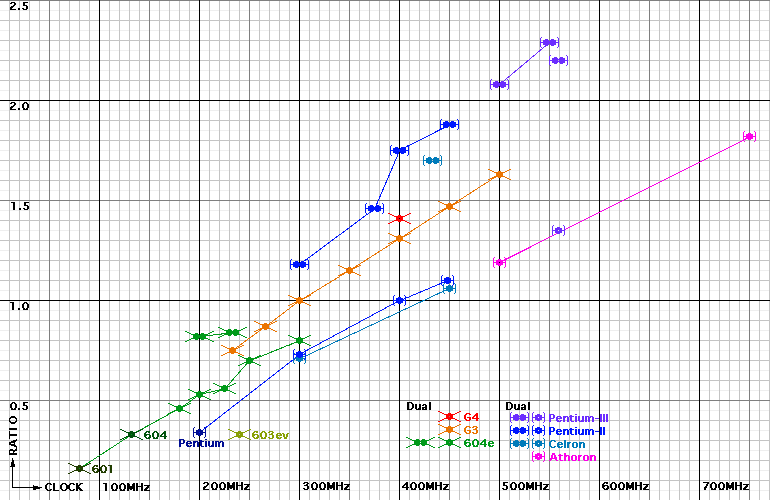最後に昔を懐かしんでSPEED WARSの最後のデータを公開しておきましょう。いや懐かしい!同盟軍(MacOS)がXファイターで、帝国軍(Windows)がTIEファイターを模したアイコンを使ってます。本体が2つになっているのがDual-CPUマシンですね。RatioはPowerMac G3 300MHzを1.0とした速度比です。クリックすると元データが表示されます。当時データを提供してくださった皆様、本当にありがとうございましたm(_ _)m